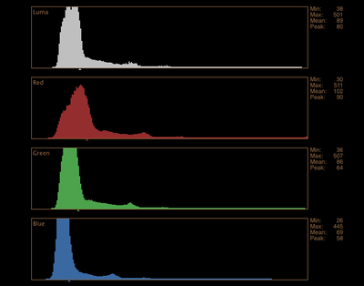 Here's a Histogram of the LogC image.  As you can see, most of the data is bunched up in the middle, with tons of space on either end to represent highlights and shadows.  Again, this doesn't mean the mid-tones get short changed, they still have all the data bits they'll ever need.